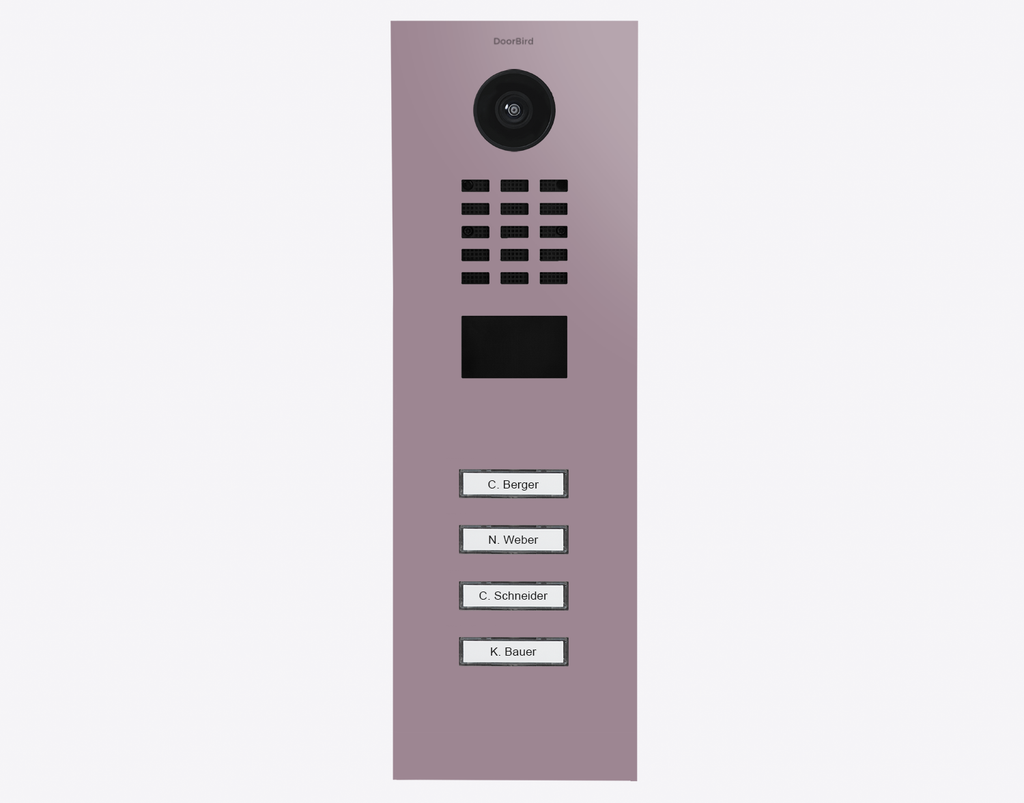 The durable Doorbird D2104V 423886575, IP VIDEO DOOR STATION, RAL 4009, stainless steel, powder-coated, semi-gloss, is for multi-tenant buildings and businesses with 4 units, and 4 call buttons.