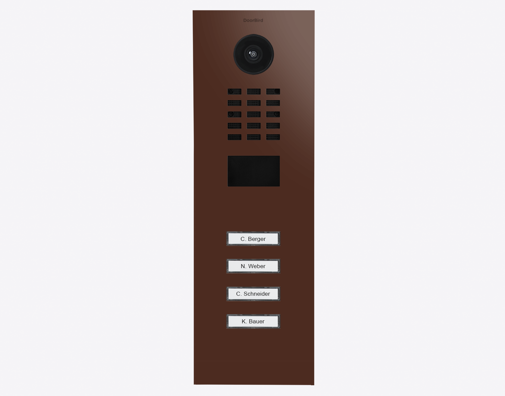 The durable Doorbird D2104V 423886797, IP VIDEO DOOR STATION, RAL 8016, stainless steel, powder-coated, semi-gloss, is for multi-tenant buildings and businesses with 4 units, and 4 call buttons.