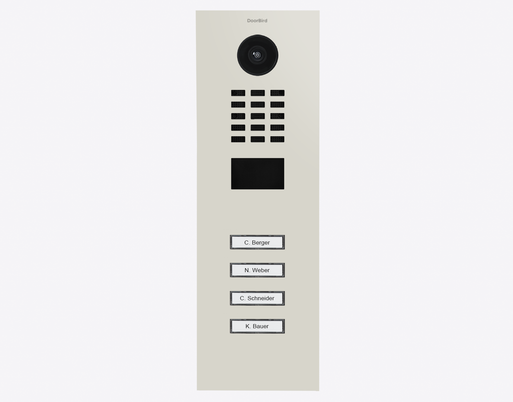 The durable Doorbird D2104V 423886827, IP VIDEO DOOR STATION, RAL 9002, stainless steel, powder-coated, semi-gloss,  is for multi-tenant buildings and businesses with 4 units, and 4 call buttons.