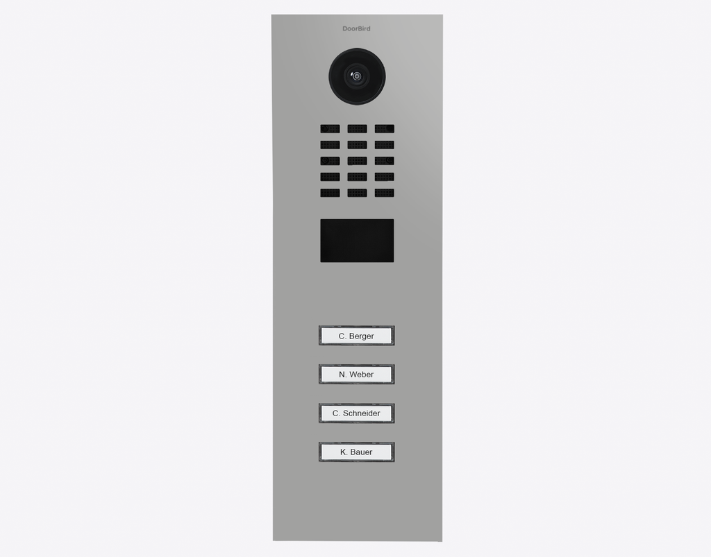 The efficient Doorbird D2104V 423886834, IP VIDEO DOOR STATION, RAL 9006, stainless steel, powder-coated, semi-gloss, is a multi-tenant building and businesses with 4 units, and 4 call buttons.