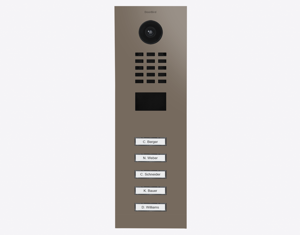 The efficient Doorbird D2105V 423887732 IP VIDEO DOOR STATION, RAL 7006, stainless steel, powder-coated, semi-gloss is for multi-tenant buildings and businesses with 5 units, and 5 call buttons.