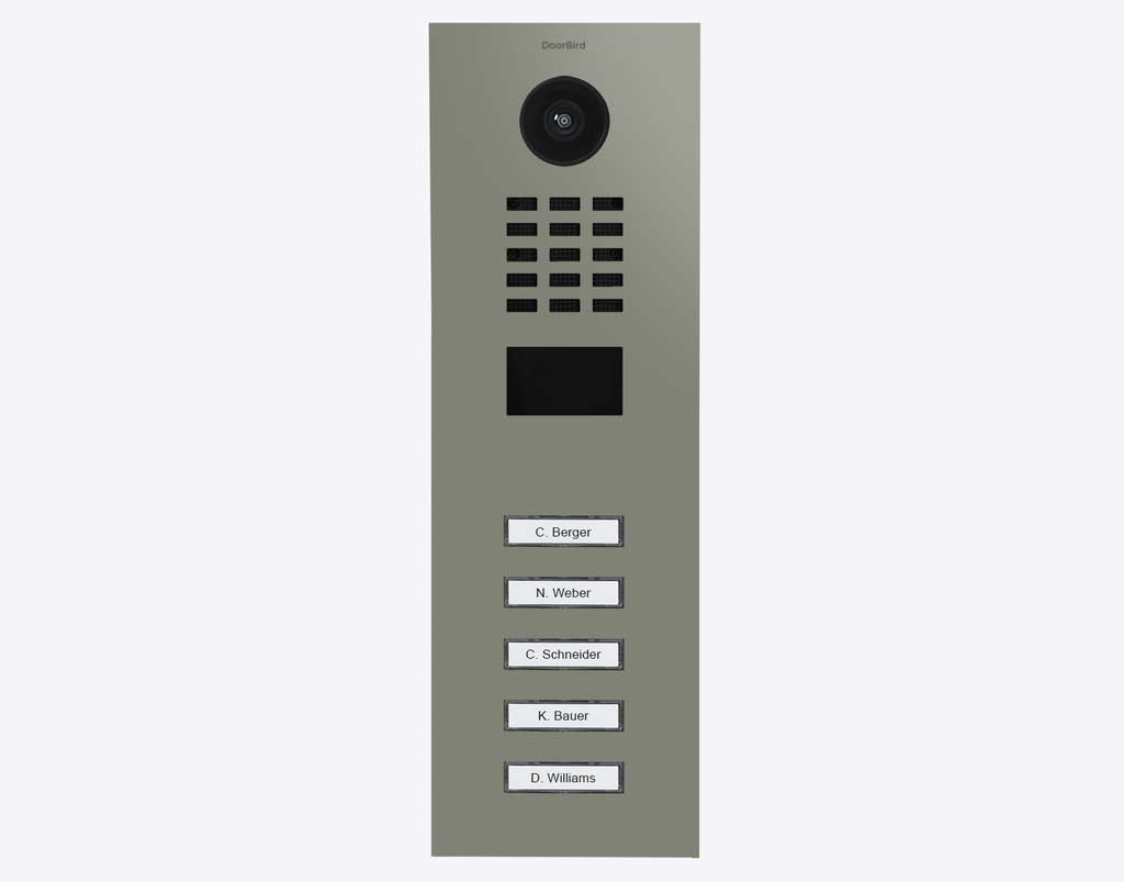 The efficient Doorbird D2105V 423887770, IP VIDEO DOOR STATION, RAL 7033, stainless steel, powder-coated, semi-gloss is for multi-tenant buildings and businesses with 5 units, and 5 call buttons.