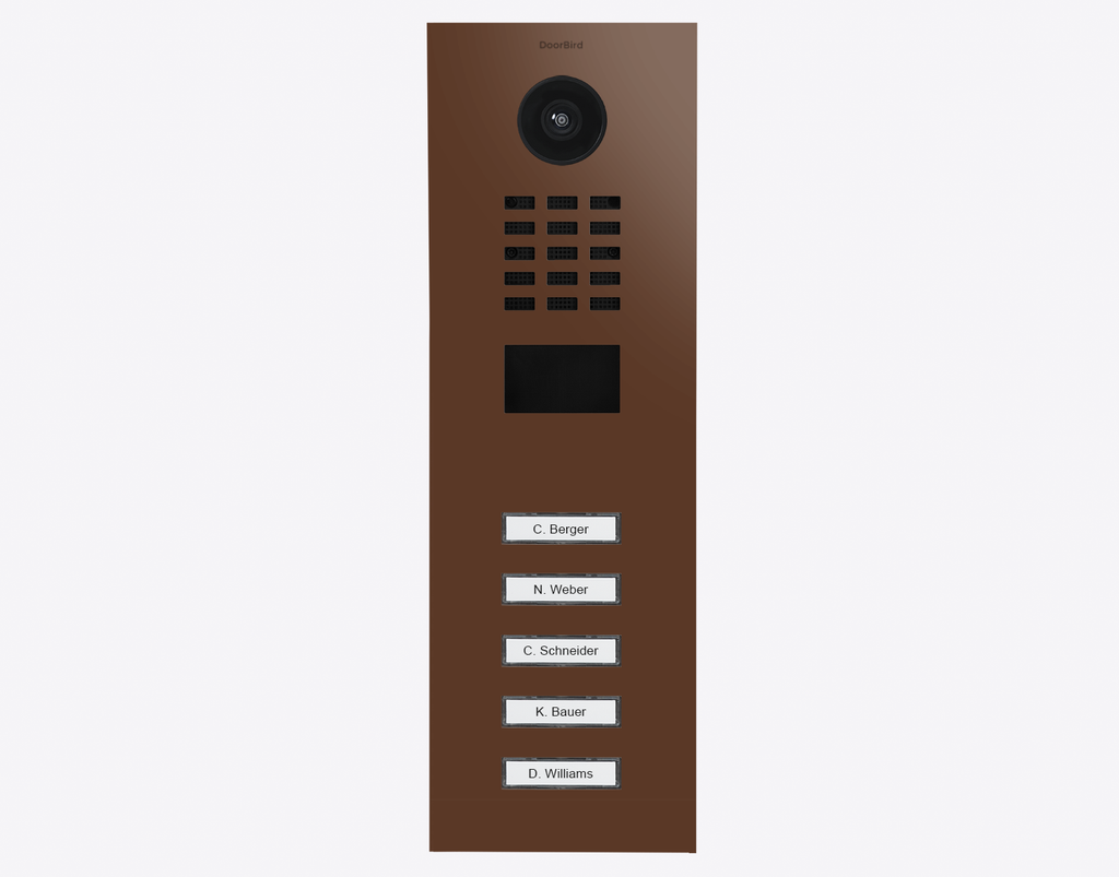 The durable Doorbird D2105V 423887800, IP VIDEO DOOR STATION, RAL 8011, stainless steel, powder-coated, semi-gloss is for multi-tenant buildings and businesses with 5 units, and 5 call buttons.