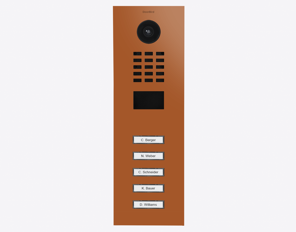 The durable Doorbird D2105V 423887824, IP VIDEO DOOR STATION, RAL 8023, stainless steel, powder-coated, semi-gloss is for multi-tenant buildings and businesses with 5 units, and 5 call buttons.