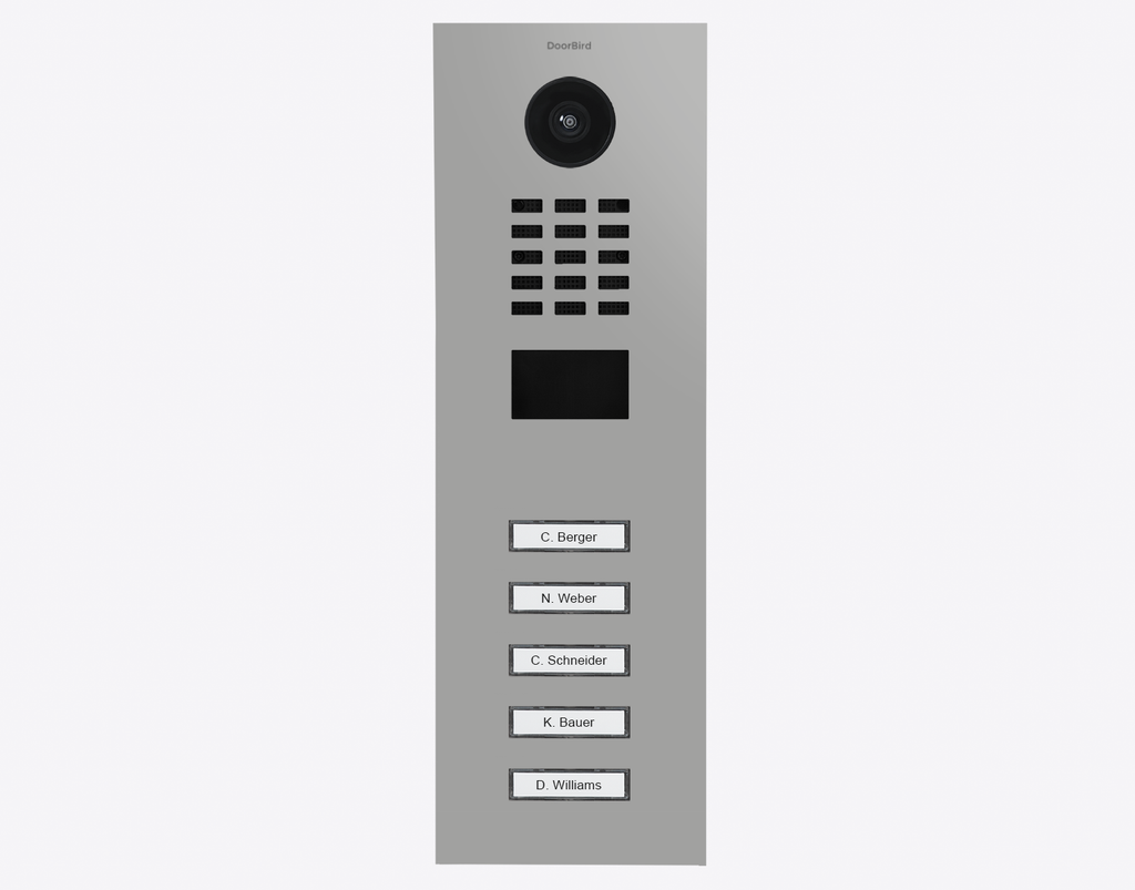 The efficient Doorbird D2105V, 423887855 IP VIDEO DOOR STATION, RAL 9006, stainless steel, powder-coated, semi-gloss is for multi-tenant buildings and businesses with 5 units, and 5 call buttons.