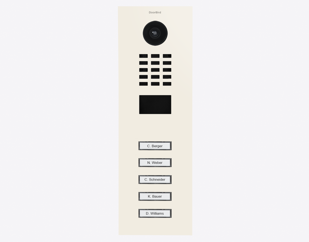 The advanced Doorbird D2105V 423887879, IP VIDEO DOOR STATION, RAL 9010, stainless steel, powder-coated, semi-gloss is for multi-tenant buildings and businesses with 5 units, and 5 call buttons.
