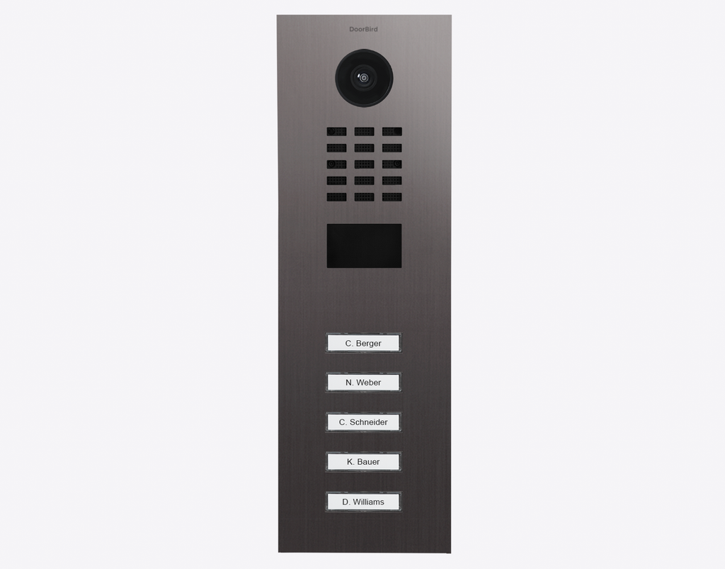 The durable Doorbird D2105V 423871359, IP VIDEO DOOR STATION, Titanium-finish as PVD coating, stainless steel, brushed, is for multi-tenant buildings and businesses with 5 units, and 5 call buttons.