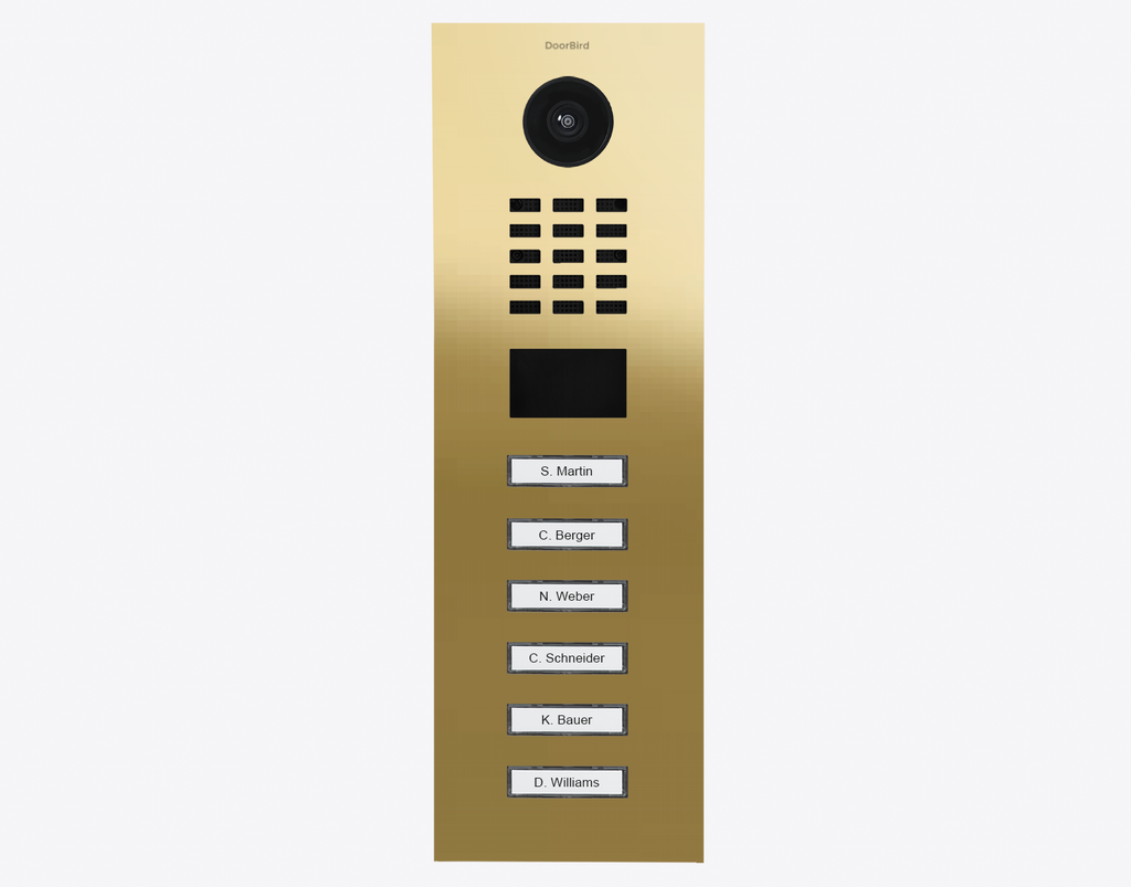 The durable Doorbird D2106V 423886902, IP VIDEO DOOR STATION, Brass-finish as PVD coating, stainless steel V4A, high-gloss polished is for multi-tenant buildings and businesses with 6 units, and 6 call buttons.