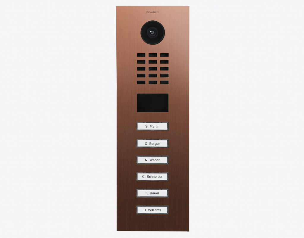 The durable Doorbird D2106V 423871380, IP VIDEO DOOR STATION, Bronze-finish as PVD coating, stainless steel, and brushed are for multi-tenant buildings and businesses with 6 units, and 6 call buttons.