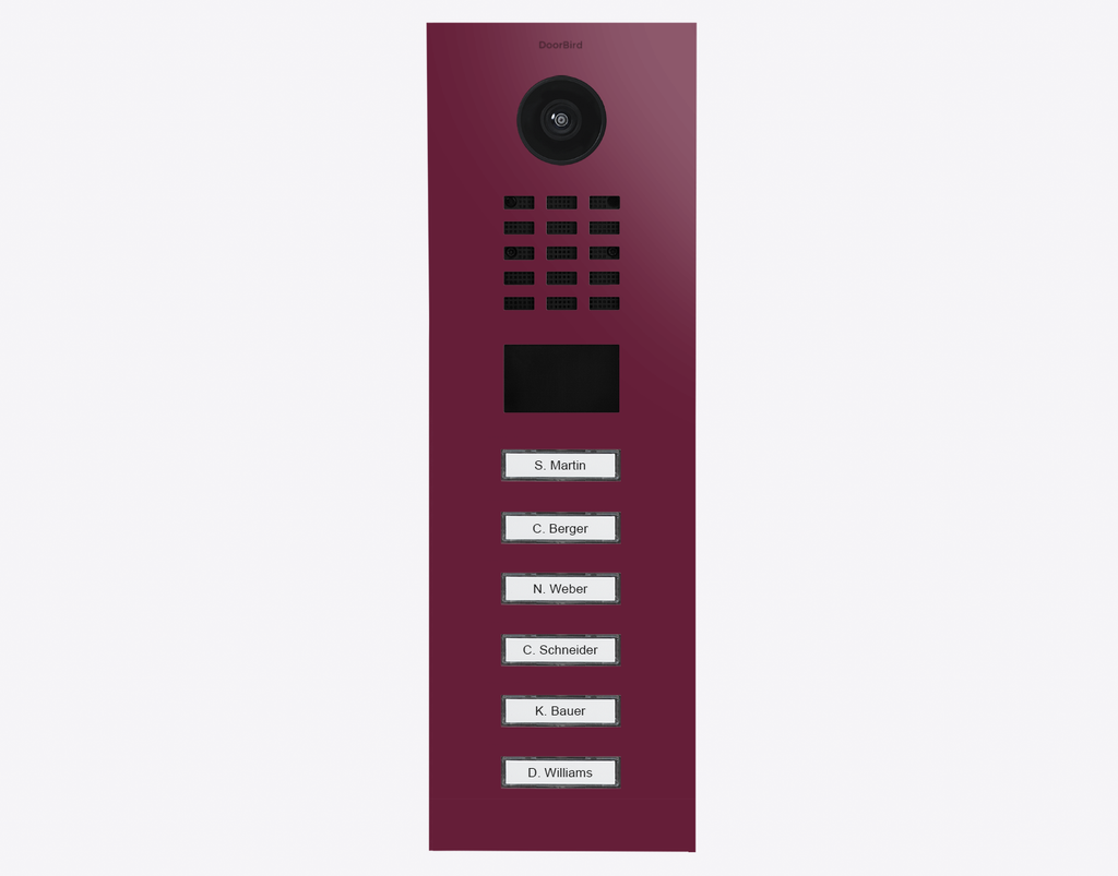 The high-performance Doorbird 423887053 D2106V, IP VIDEO DOOR STATION, RAL 4004, stainless steel, powder-coated, semi-gloss is for multi-tenant buildings and businesses with 6 units, and 6 call buttons.