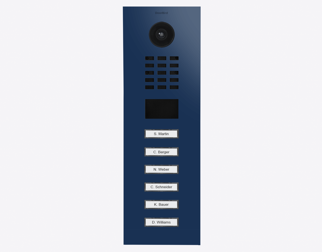 The durable Doorbird D2106V 423887121, IP VIDEO DOOR STATION, RAL 5013, stainless steel, powder-coated, semi-gloss is for multi-tenant buildings and businesses with 6 units and 6 call buttons.