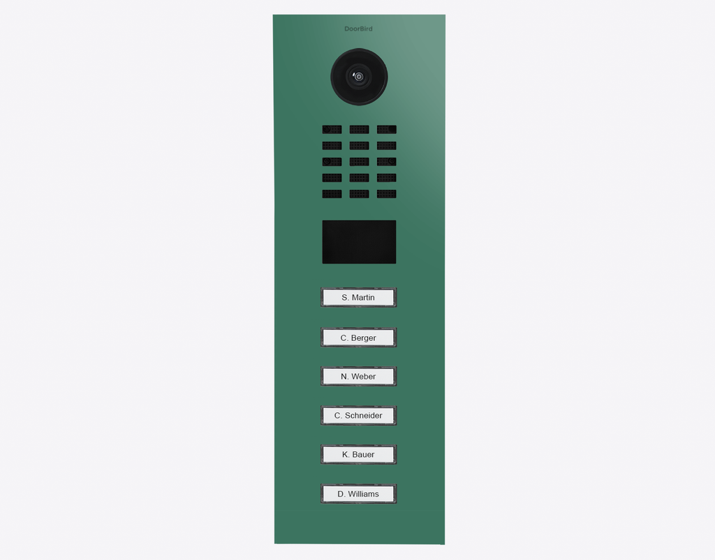 The durable Doorbird 423887152 D2106V, IP VIDEO DOOR STATION, RAL 6000, stainless steel, powder-coated, semi-gloss is for multi-tenant buildings and businesses with 6 units, and 6 call buttons.