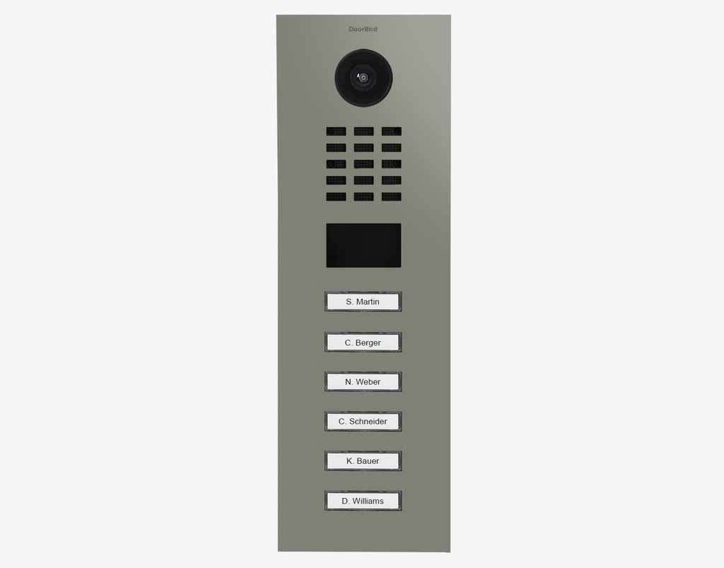 The durable Doorbird D2106V 423887251, IP VIDEO DOOR STATION, RAL 7023, stainless steel, powder-coated, semi-gloss is for multi-tenant buildings and businesses with 6 units, and 6 call buttons.