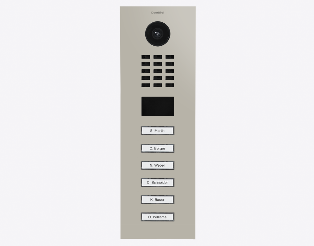 The efficient Doorbird D2106V 423887275 IP VIDEO DOOR STATION, RAL 7044, stainless steel, powder-coated, semi-gloss is for multi-tenant buildings and businesses with 6 units, and 6 call buttons.