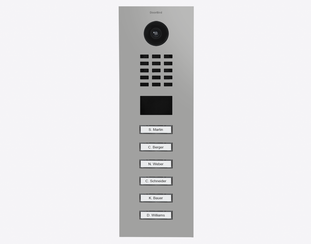 The durable Doorbird D2106V 423887343, IP VIDEO DOOR STATION, RAL 9006, stainless steel, powder-coated, semi-gloss is for multi-tenant buildings and businesses with 6 units, and 6 call buttons.