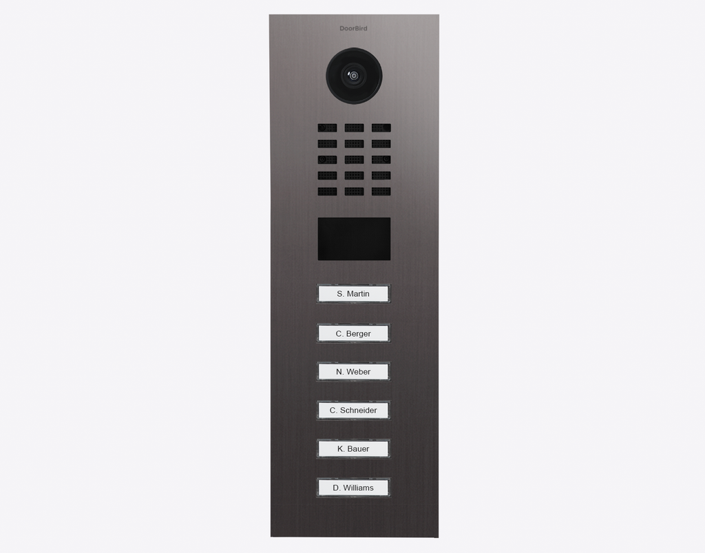 The durable Doorbird D2106V 423871397, IP VIDEO DOOR STATION, Titanium-finish as PVD coating, stainless steel, and brushed is for multi-tenant buildings and businesses with 6 units, and 6 call buttons.