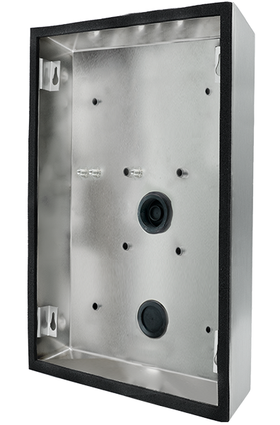 The Surface-mounting housing (backbox) for DoorBird D2109V, D2111V, D2112V, D2113V and D2114V door panels made from stainless steel V2A available in 2 variants.