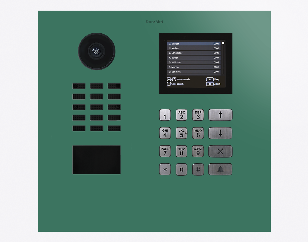 The durable Doorbird D21DKH 423888753, IP VIDEO DOOR STATION, RAL 6000, stainless steel, powder-coated, semi-gloss is for multi-tenant residences and buildings with up to 500 units.