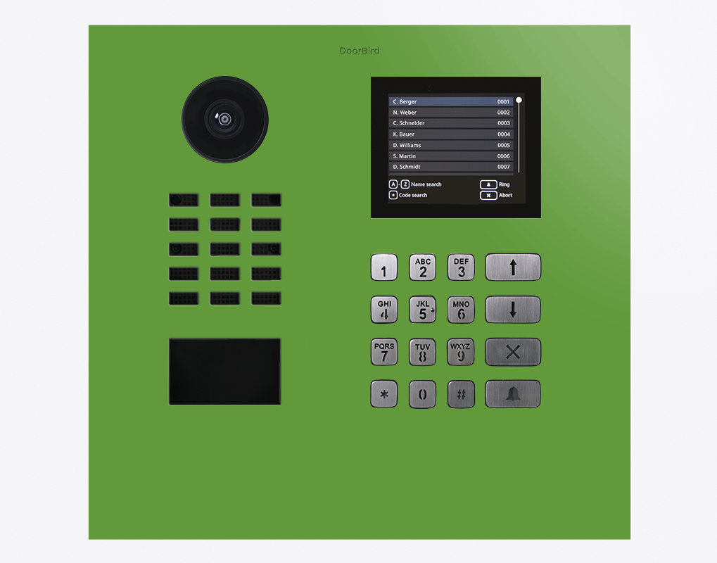 The efficient Doorbird D21DKH 423888777, IP VIDEO DOOR STATION, RAL 6018, stainless steel, powder-coated, semi-gloss is for multi-tenant residences and buildings with up to 500 units.