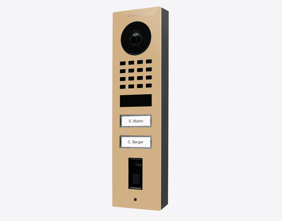 The durable Doorbird D1102FV-S 423895096, FINGERPRINT 50 SURFACE-MOUNT IP VIDEO DOOR STATION, RAL 1001, stainless steel, powder-coated, semi-gloss, for multi-tenant buildings and businesses with 2 units, and 2 call buttons.